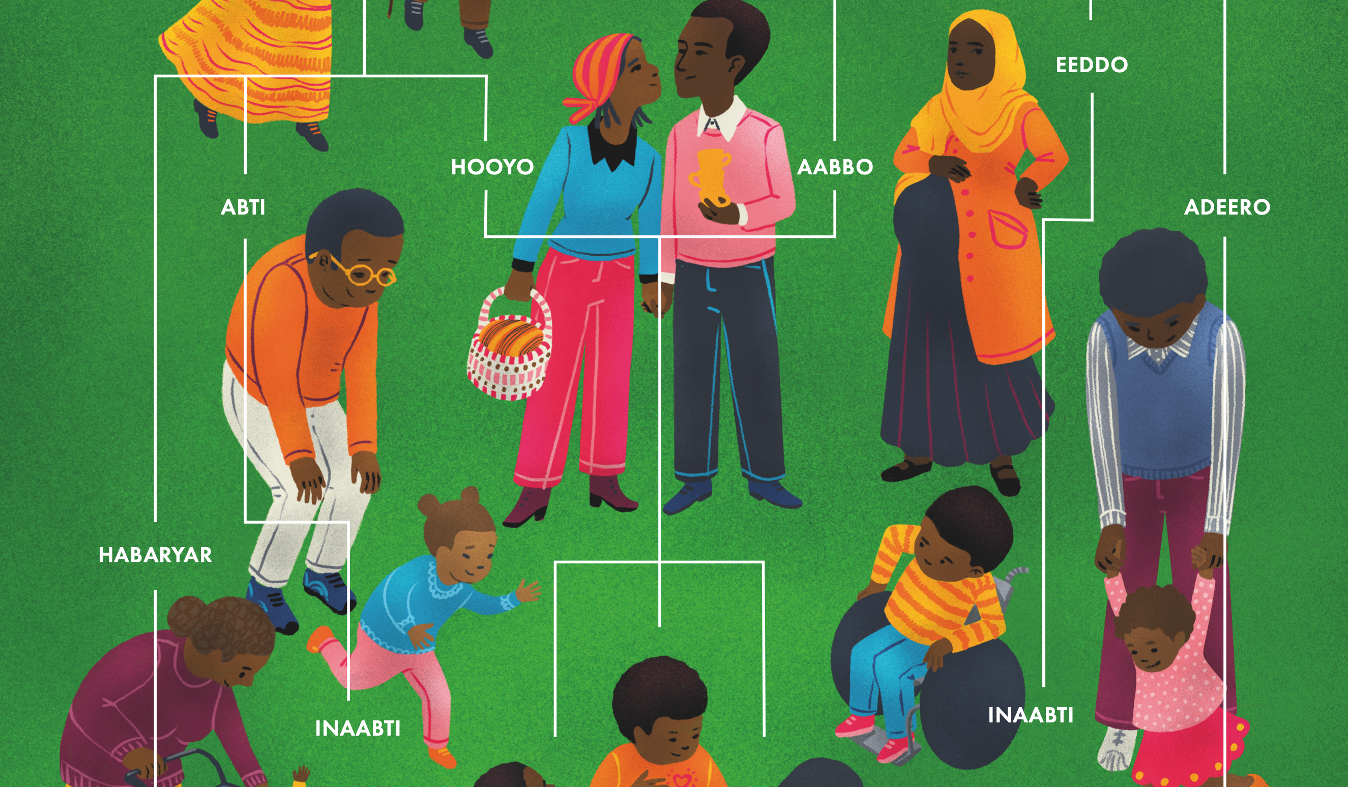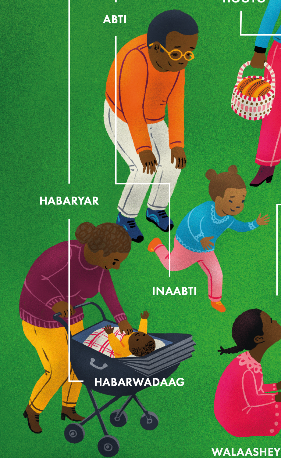 Celebrate family with this beautifully designed and colorful poster, featuring Somali words for relatives across generations, from grandparents to aunts and beyond.